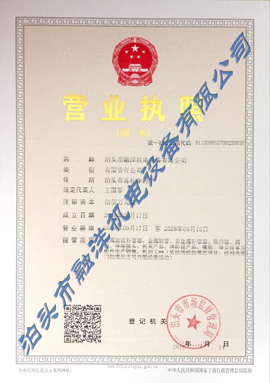 泊头市融洋机电设备有限公司位于河北省泊头市肖杜李工业区,主要致力于金属波纹管、非金属波纹管、金属波纹补偿器、非金属补偿器、金属软管、过滤器等产品的研制生产,是国内大口径金属波纹管的制造商。